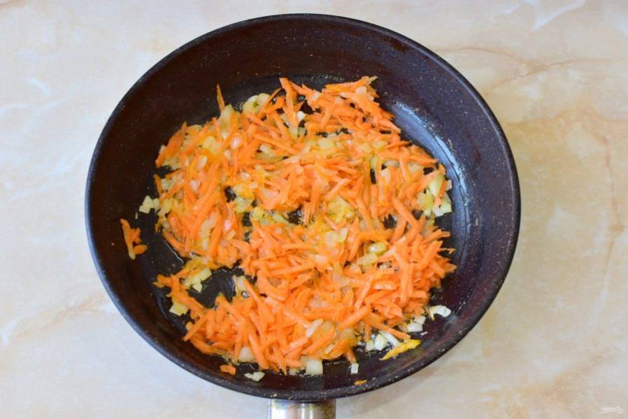 Затем добавьте морковь, натертую на крупной терке. Обжарьте еще 3-5 минут. От овощей появится характерный аромат.