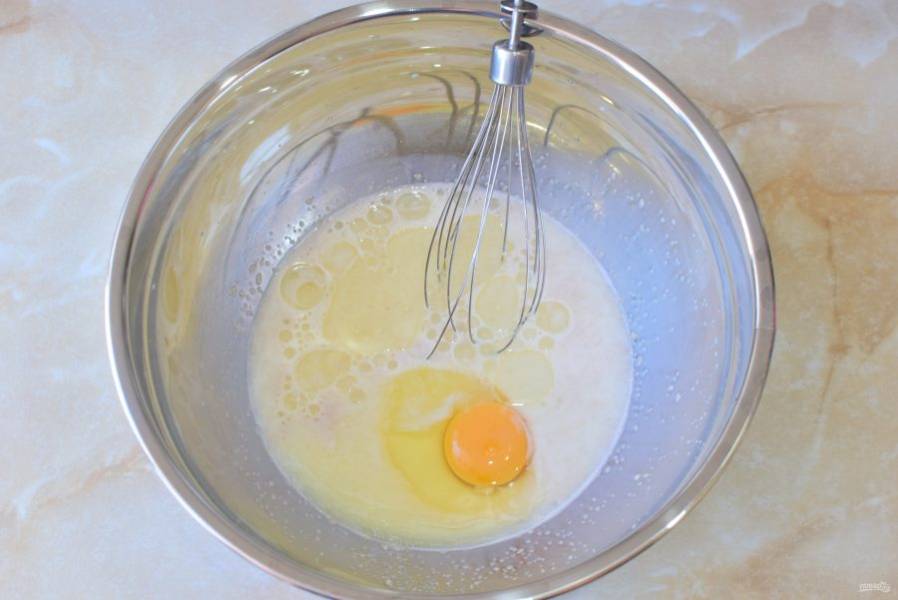 Для теста налейте в чашу теплое молоко и добавьте соль, сахар и сухие дрожжи. Смешайте. Затем разбейте яйцо и влейте растительное масло.
