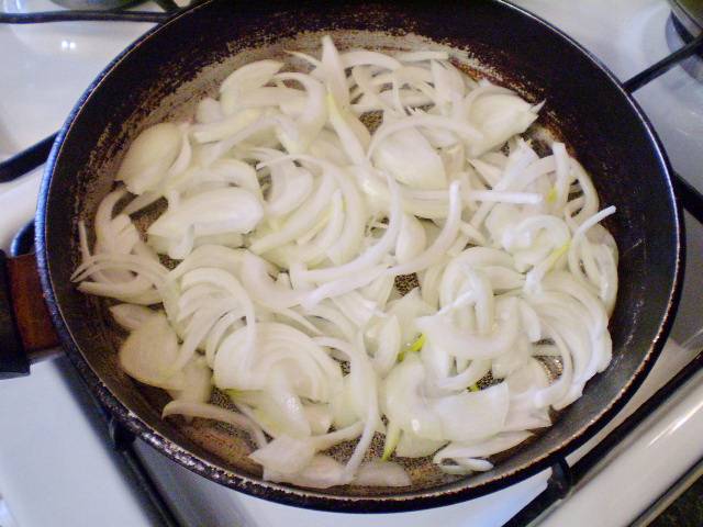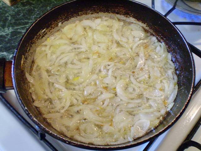 3. Репчатый очищенный лук порежьте и отправьте на масле жарится до золотистого цвета.