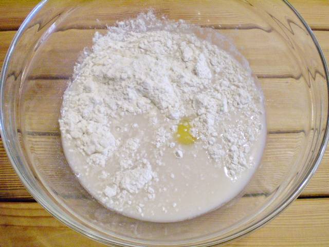 6. Вводим все остальные продукты для теста и смешиваем. Муку вводим постепенно, вымешивая не крутой колобок.