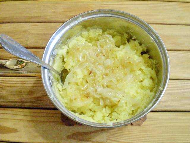 9. Добавьте жареный лук и перемешайте. Начинка готова.