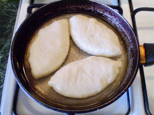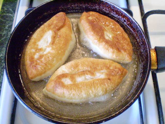 12. Выкладываем пирожки в раскаленное масло, масла должно быть много, чтобы пирожки хорошо поднимались. И жарим.