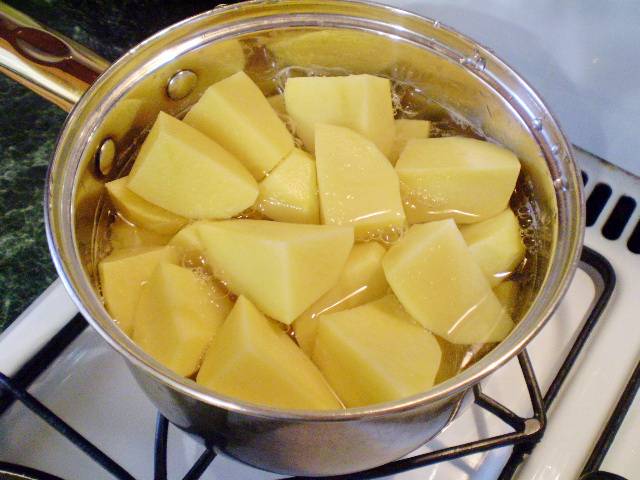 2. Сначала нужно отварить картофель для начинки. Для этого порежьте его крупно, залейте водой, посолите и варите 25 минут под крышкой.