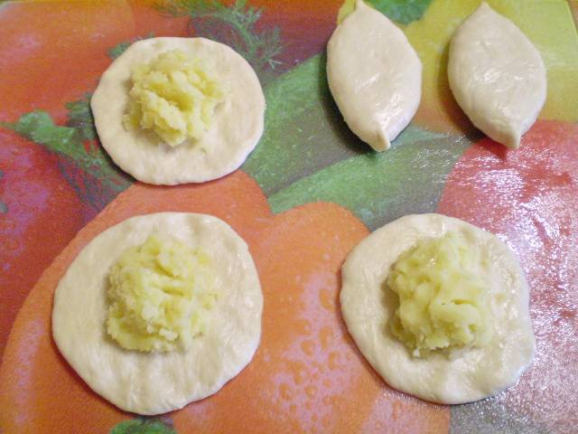 11. Раскатываем каждый шарик руками. Муку не используем. Лучше все делать масляными руками. Кладем по ложке начинки. Залепливаем края, переворачиваем швом вниз.