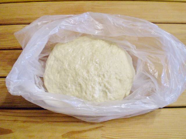 7. Вот такое получилось быстрое тесто. Заворачиваем его в пакет, я предварительно пакет смазываю маслом, чтобы тесто не прилипало к нему. И оставляем его на 10-15 минут, пока сварится картофель.