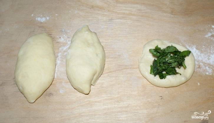2. Щавель помоем, измельчим и смешаем с оставшимся сахаром. Из теста сделаем лепешки, внутрь каждой кладем начинку. Формируем пирожки.