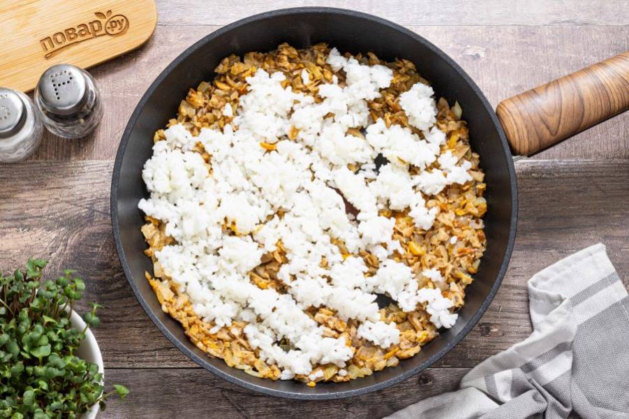 После добавьте отварной рис. По желанию можно добавить по вкусу соль и черный молотый перец. Все перемешайте и снимите с огня.
