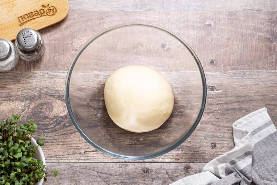 Вымесите тесто на столе около 5 минут. Тесто должно получиться мягким, податливым, может чуть липнуть к рукам. Скатайте тесто в шар, выложите в глубокую миску смазанную растительным маслом. Накройте пленкой и уберите в теплое место на 1 час.