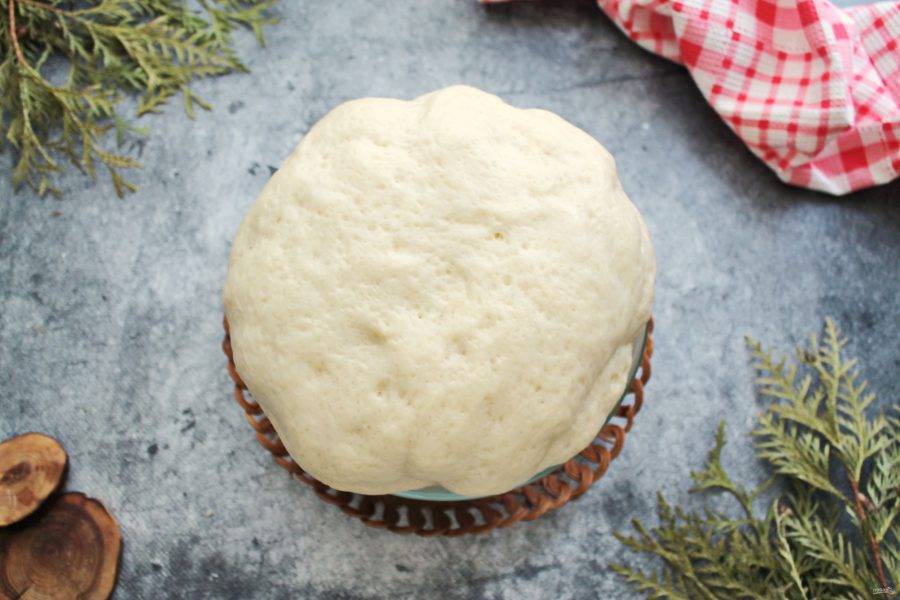 Миску с тестом накройте и уберите в теплое место для подъема на 50-60 минут.
