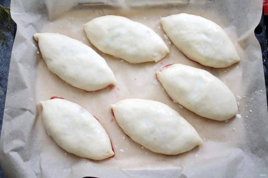 Сформируйте пирожки и выложите их на противень застеленный пергаментом. Противень накройте и оставьте на 20 минут для расстойки. Смажьте верх пирожков молоком и поставьте в горячую духовку. Выпекайте пирожки при температуре 180 градусов в течение 20-25 минут до готовности. Готовые пирожки достаньте, смажьте растительным маслом и накройте на 5-10 минут, чтобы они отпыхли.