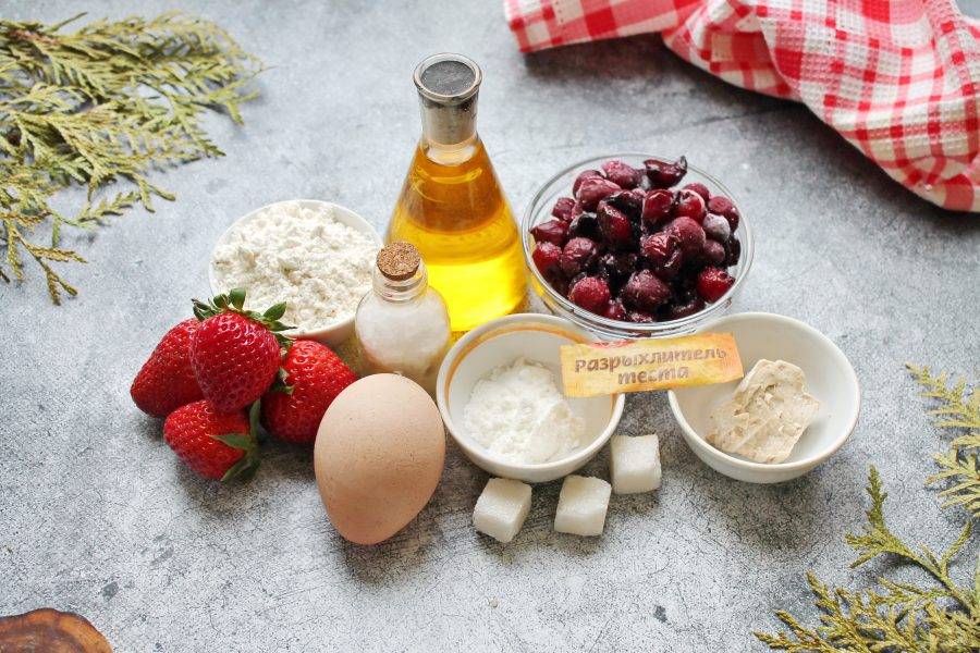 Подготовьте все необходимые ингредиенты для приготовления пирожков с вишней и клубникой. Если вишня замороженная, предварительно нужно ее разморозить и слить сок. Клубнику необходимо вымыть, обсушить и отрезать хвостики.