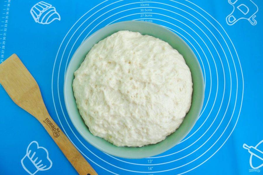 Замесите мягкое, эластичное, не липнущее к рукам тесто. Накройте его пищевой пленкой или полотенцем и поставьте в теплое место. Через час-полтора тесто увеличится в объеме и будет готово к работе.