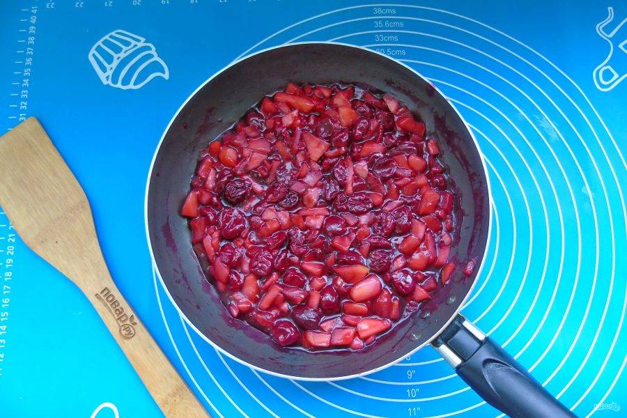 Пока тесто подходит, подготовьте начинку из вишни и яблок. В сковороду или сотейник выложите вишню без косточек и нарезанные яблоки.