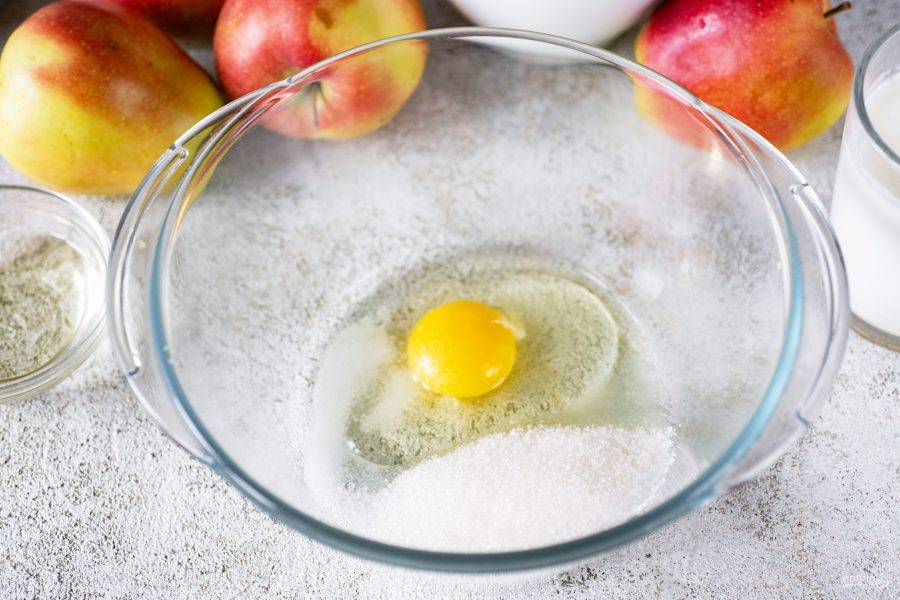 Приготовьте сначала тесто. В просторную миску вбейте яйцо, добавьте сахар и соль.