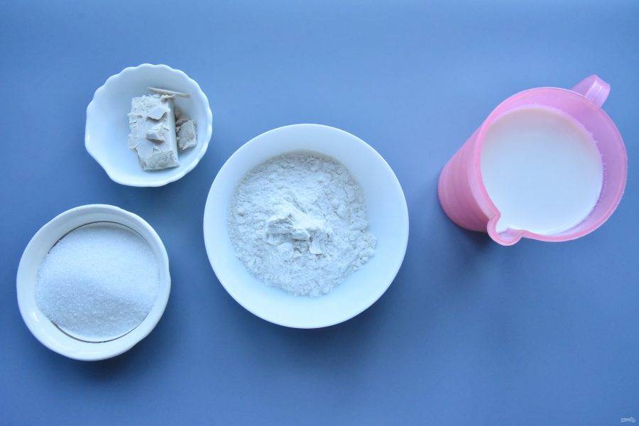 Для начала подготовьте опару для теста. Молоко подогрейте в микроволновой печи в течение 30 секунд, для того чтобы активировать дрожжи. Муку просейте и возьмите из общего количества 6 ст.л. Если используете сухие дрожжи, уменьшите количество в три раза т.е. 10 граммов будет достаточно. Размешайте в теплом молоке сахар с дрожжами, добавьте муку. Перемешайте смесь венчиком и накройте пищевой пленкой. Оставьте опару в теплом месте для подъема.
