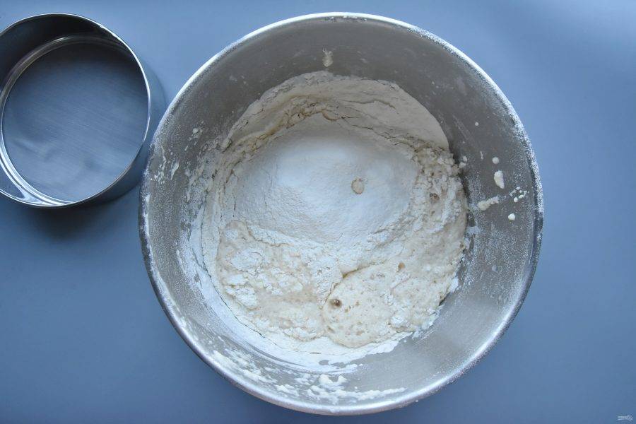 Когда опара будет готова, соедините ее с оставшимися компонентами теста: растительным маслом, солью, яйцами и мукой.