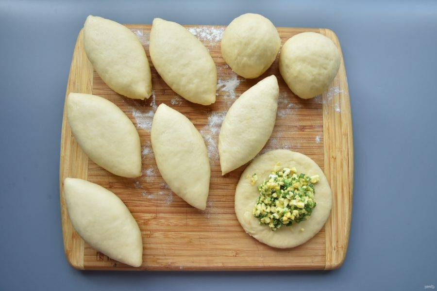 Каждый шарик теста раскатайте в лепешку и в центр выложите порцию яичной начинки. Закрепите края теста, формируя пирожок желаемой формы.
