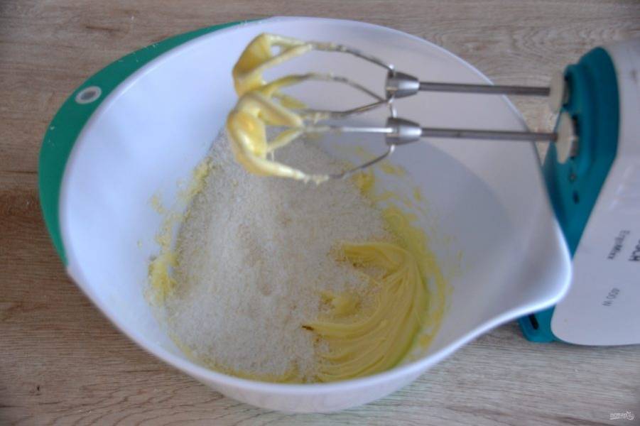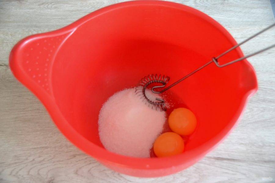Отделите белки и желтки двух яиц в разную посуду. Желтки разотрите с сахаром добела.