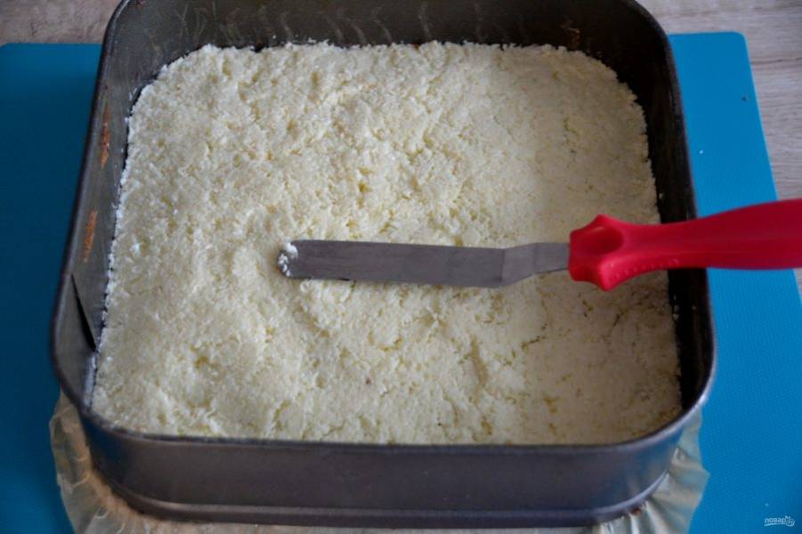 Подготовьте форму для выпекания, дно застелите пергаментом, смажьте сливочным маслом, слегка присыпьте мукой. Излишки муки стряхните. Выложите тесто, разровняйте.