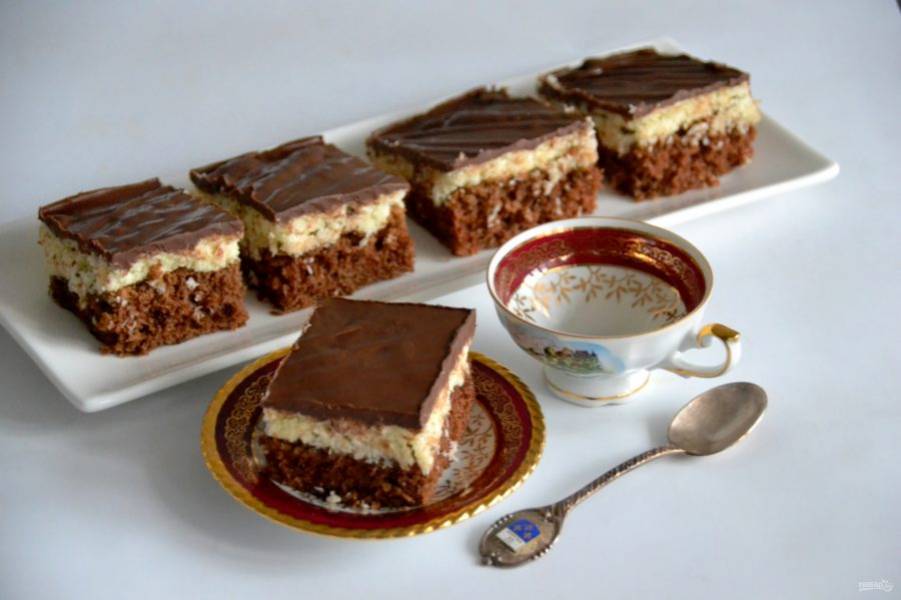 Любителям шоколадных батончиков "Баунти" и кокосового вкуса эти пирожные не могут не понравиться. Потому что в них есть все — и вкус кокоса и много шоколада. А готовить очень просто, делюсь рецептом!