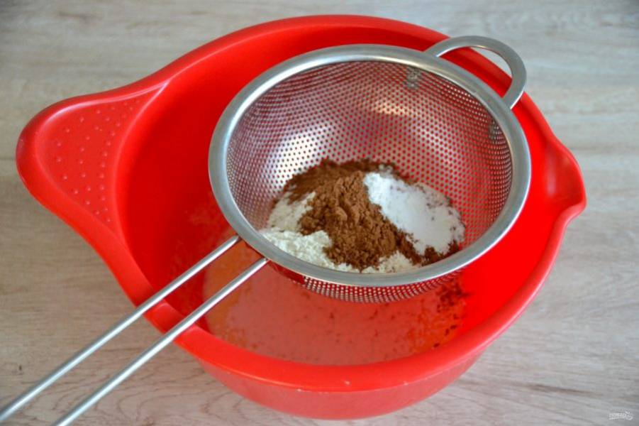 Просейте в желтковую массу муку, какао порошок и разрыхлитель.