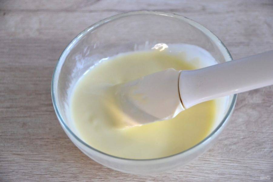 В микроволновой печи или на водяной бане растопите белый шоколад, после чего в уже растопленный шоколад добавьте 2 ст. ложки растительного масла.