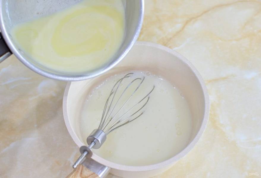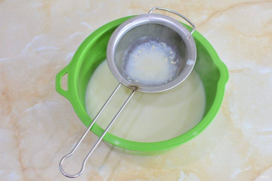 Молочно-шоколадную массу процедите через ситечко. Затем накройте пленкой и остудите до комнатной температуры, периодически помешивая. Не пропустите, чтобы масса не стала желироваться.