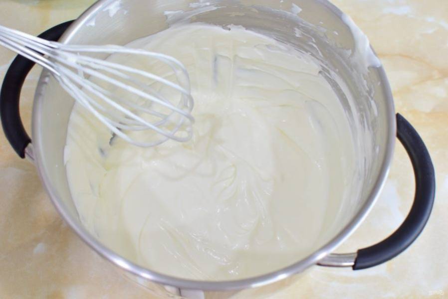 Взбитые сливки понемногу вмешивайте венчиком в молочную массу.