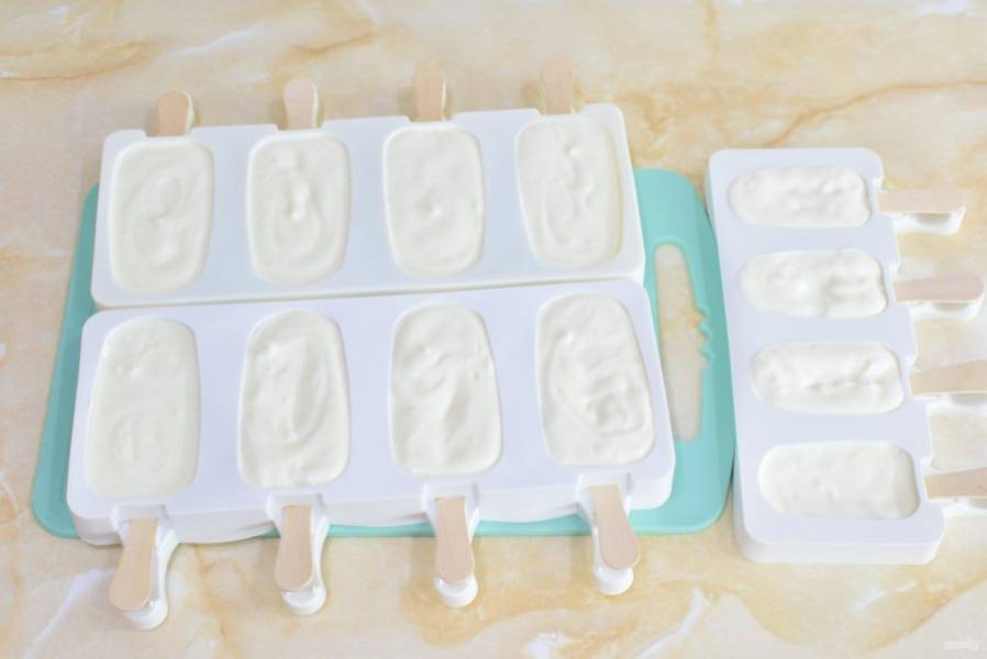 В формы для эскимо вставьте палочки. В кондитерский мешок выложите мусс и наполните формочки. Уберите все в морозилку на несколько часов, до полной заморозки.
