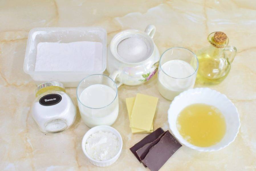 Молоко налейте примерно напополам в два ковша. В один добавьте сахар, крахмал и ванилин, а в другой белый шоколад. Поставьте на огонь и доведите до кипения. Сахар должен раствориться, за счет крахмала масса немного загустеет. Шоколад расплавится.