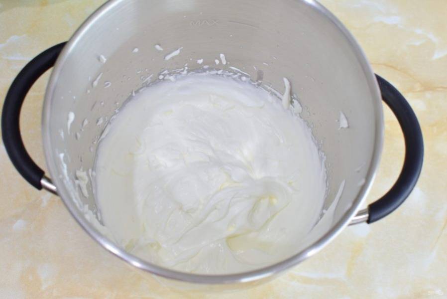 Жирные сливки взбейте с сахарной пудрой. Они должны стать густые, но не стабильные. Форму сливки еще не держат, но след от ложки остается.