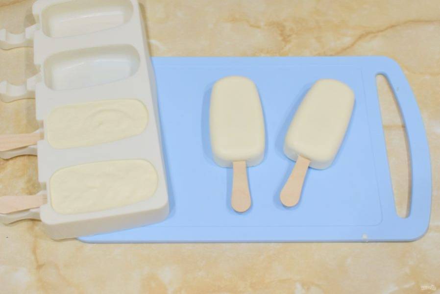 Замерзшие эскимо извлеките из формы. В таком виде их можно хранить в морозилке до момента заливки шоколадом.