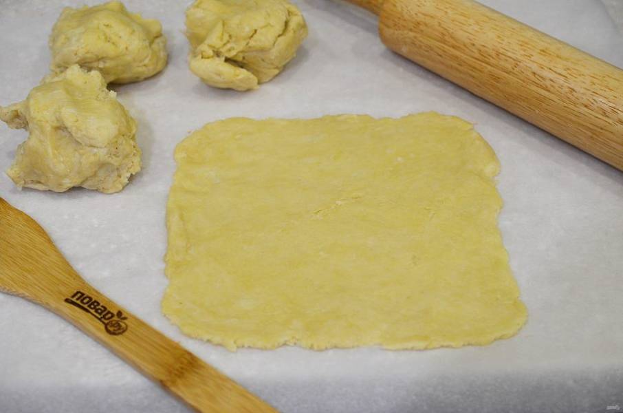 9. Тесто разделите на 4 части. Раскатайте каждую в прямоугольник, толщиной около 5 мм.