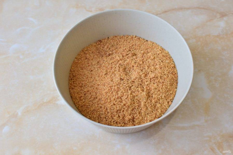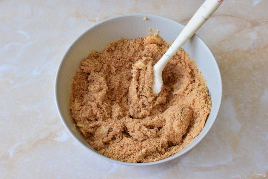 Печенье измельчите. Для этого его можно натереть на терке, прокрутить через мясорубку или перемолоть в измельчителе.