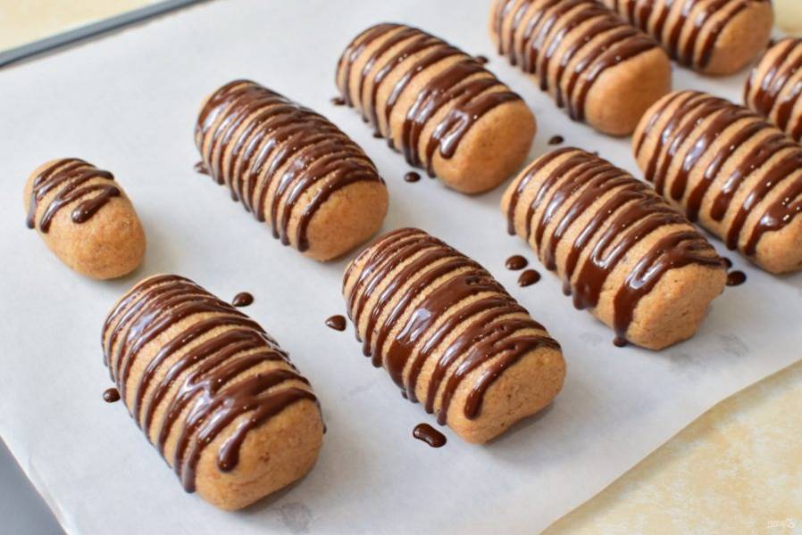Растопленный шоколад нанесите на пирожное. Затем поставьте их в холодильник на 1 час для застывания.