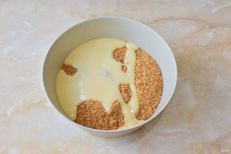 Начинайте все перемешивать. Остальную сгущенку подливайте по необходимости, чтоб не сделать массу сильно влажной.