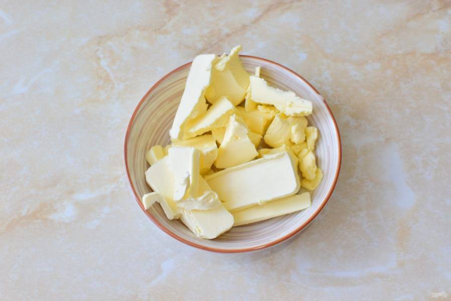 Сливочное масло заранее вытащите из холодильника, чтобы оно стало мягкое. Чтобы ускорить этот процесс, нарежьте масло на кусочки. Можно немного погреть его в микроволновой печи. Полностью растапливать не надо. Просто нагреть до мягкости.