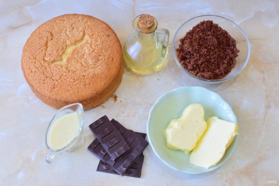 Для приготовления пирожного подготовьте необходимые ингредиенты. Бисквит необходимо измельчить в крошку. Сливочное масло заранее вытащите из холодильника, чтобы оно стало мягкое.