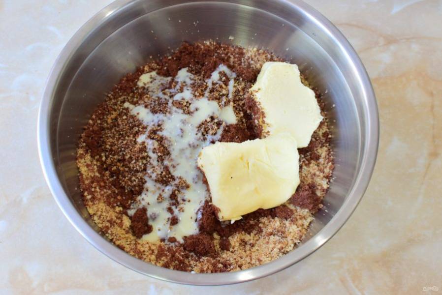 Добавьте к бисквитной крошке сгущенку и сливочное масло. Все ингредиенты смешайте.