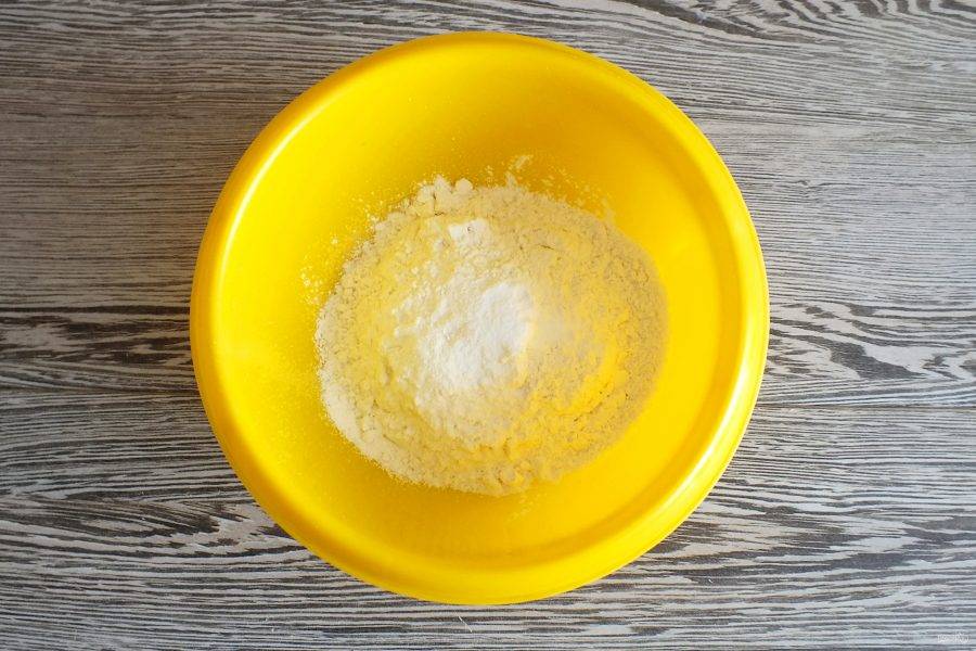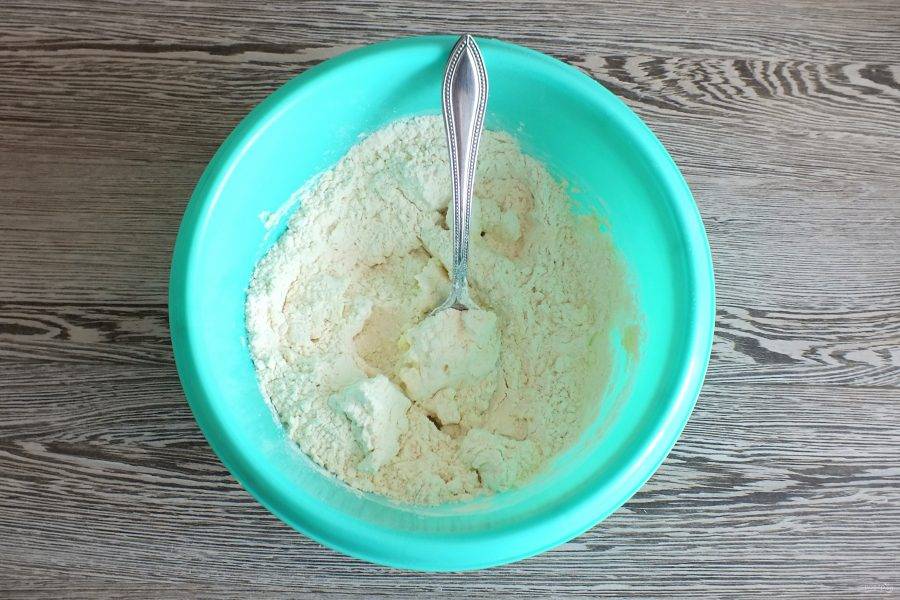 Добавьте мучную смесь к масляной. Перемешайте. Замесите тесто руками.