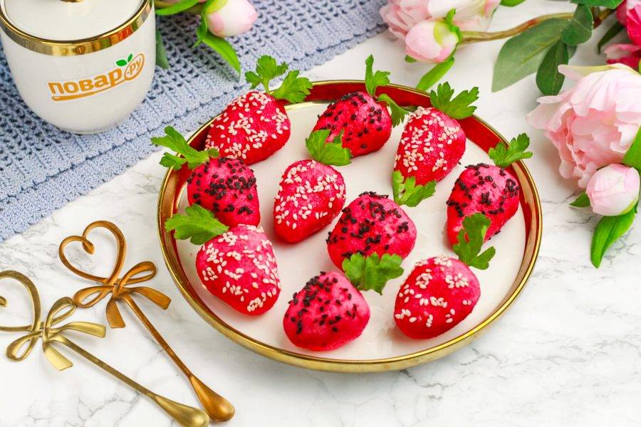 Самое желанное пирожное родом из детства — это красочные клубнички, приготовленные из вафель. Яркий цвет им придает сок свеклы, а зернами служат семена кунжута: белые и черные.