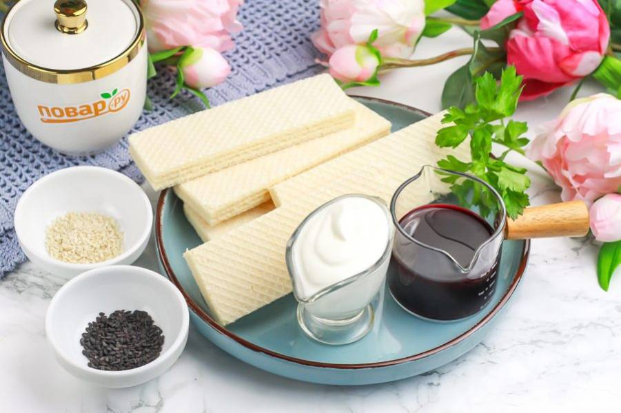 Подготовьте указанные продукты. Вафли приобретайте светлые, не шоколадные. Сок свеклы можно получить, если заранее натереть на терке и отдать свежую или запеченную свеклу.