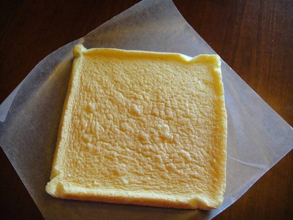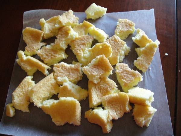 2. Готовый и охлажденный бисквит разломайте на небольшие кусочки.