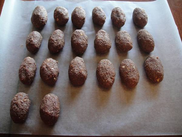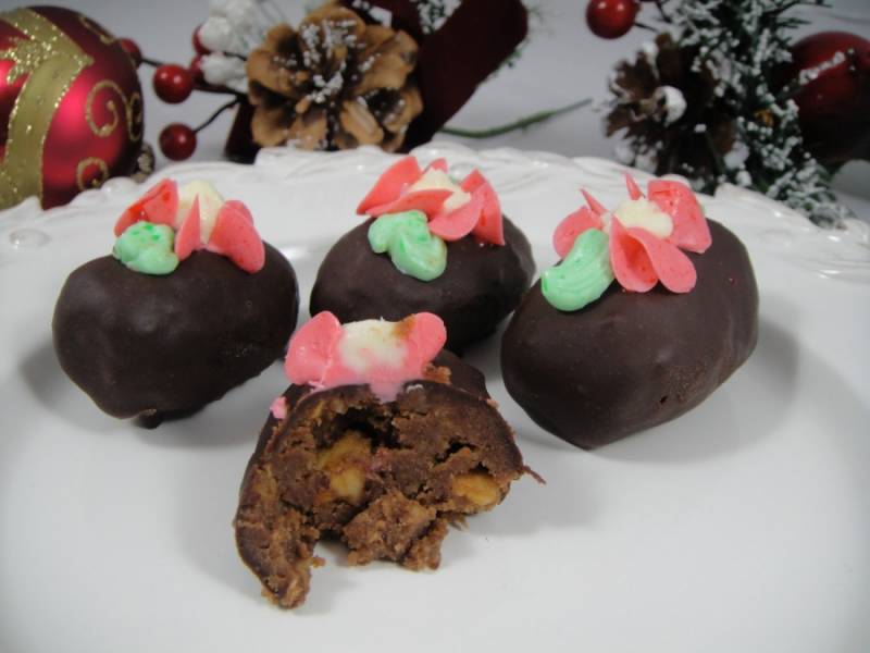 5. Плитку шоколада растопите и немного остудите. Половину размягченного сливочного масла соедините со сгущенкой и взбейте. Добавьте остывший шоколад, крошку бисквита и орехи. Все как следует перемешайте, из получившейся массы сформируйте небольшие пирожные.