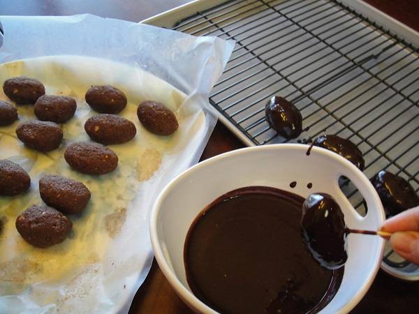 6. Отправьте их на 15-20 минут в холодильник, а тем временем займитесь глазурью. Растопите сливочное масло и шоколад на водяной бане. После аккуратно обмакните каждое пирожное в глазурь и выложите на решетку для застывания.