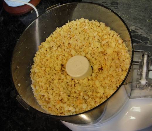 4. Дробленые орехи переложите в глубокую мисочку, а в чашу выложите кусочки бисквита. Измельчите в однородную крошку.