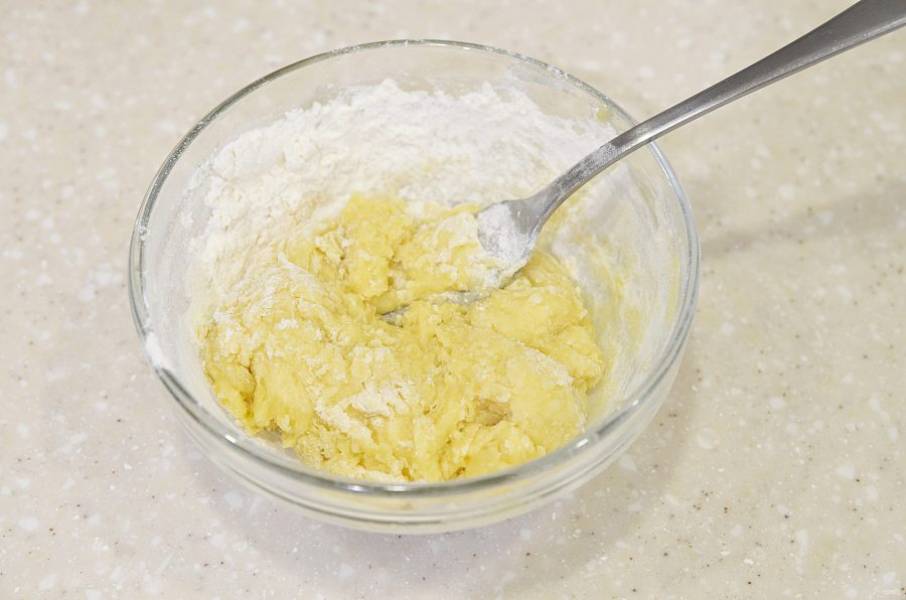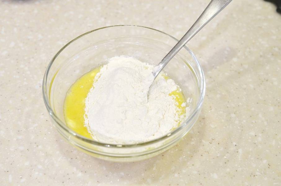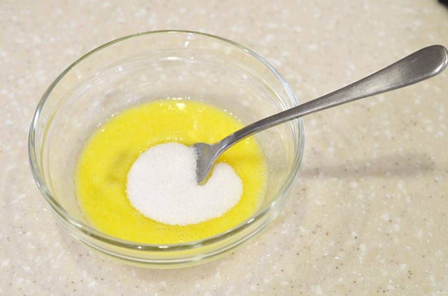 Добавьте сахар, растопленное масло и еще раз взбейте.