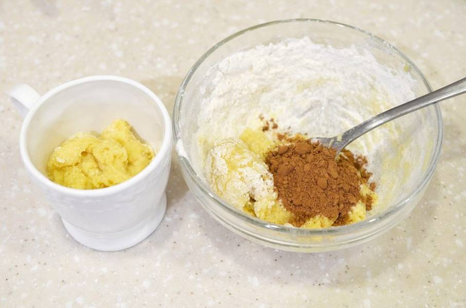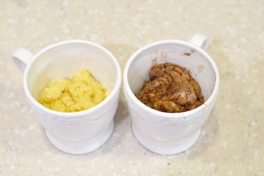 Половину теста выложите в кружку, наполнив ее наполовину. В другую половину теста добавьте какао-порошок и перемешайте.