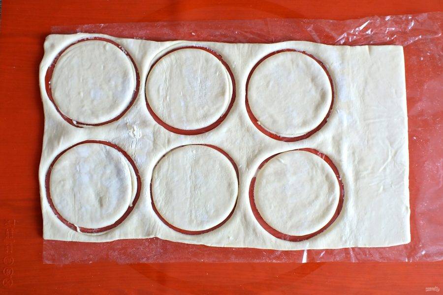 Слоёное тесто выложите на рабочую поверхность подпыленную мукой. С помощью стакана вырежьте круглые заготовки. По размеру они должны поместиться в формочки, в которых вы будете выпекать пирожные.