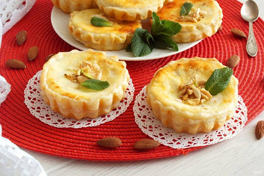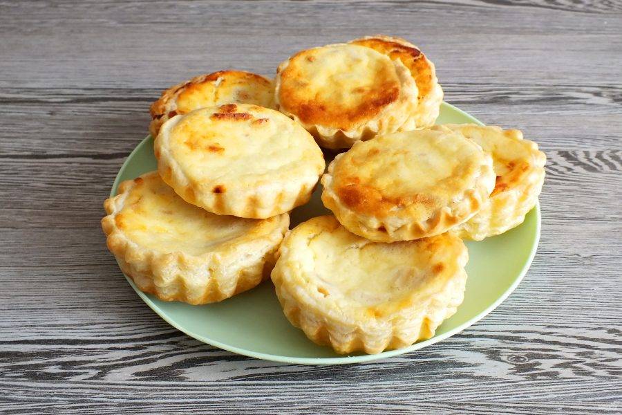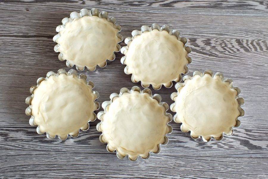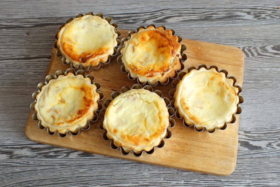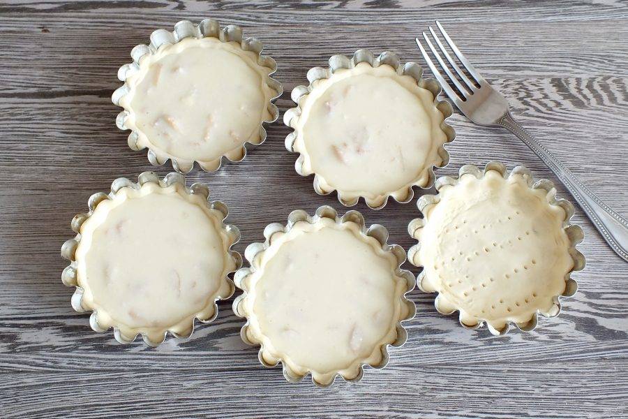 Тесто в формочках наколите вилкой. Разложите начинку. Поставьте в разогретую до 180 градусов духовку на 20-25 минут. Не допускайте сильного зарумянивания верха!